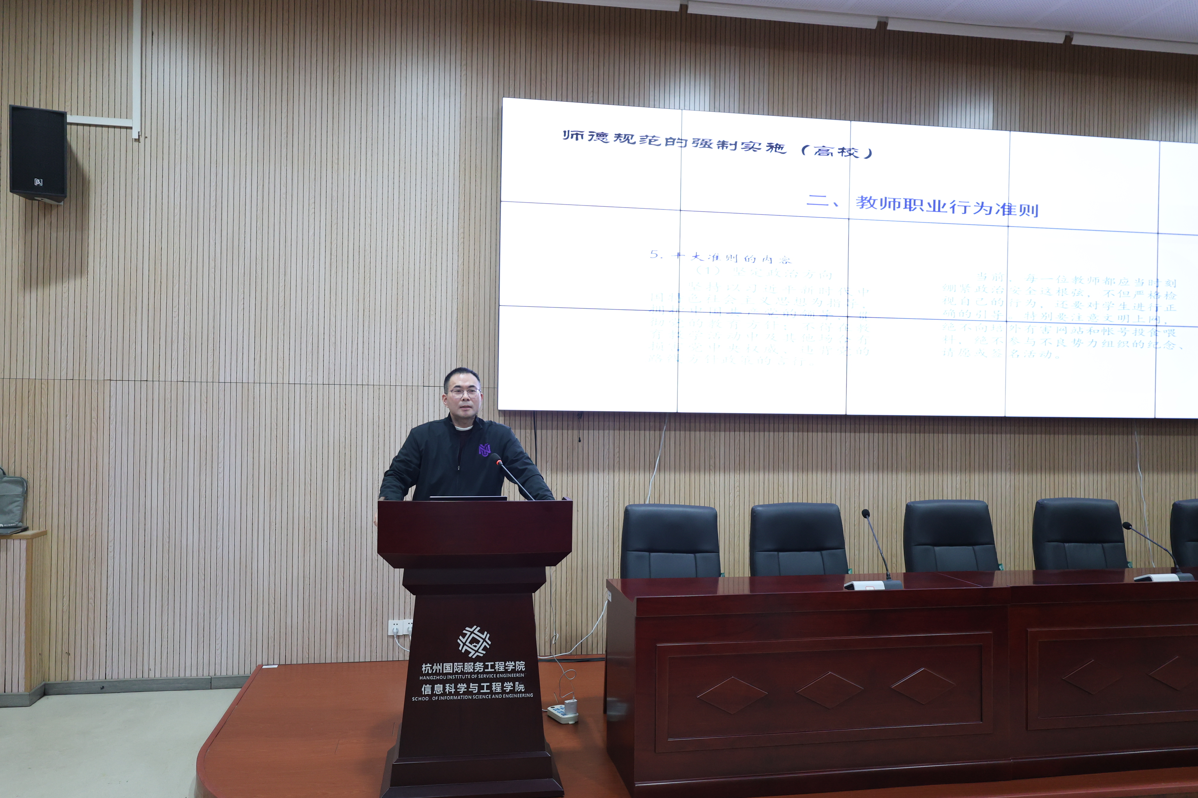 会议还邀请了沈钧儒法学院副教授张国华老师解读高校师德规范的强制实施。他指出,职业行为准则中的职业道德规范属纪律规范,具强制性。《新时代高校教师职业行为十项准则》是教师职业行为基本规范,师德师风是教师队伍素质评价第一标准。在教师管理上,要严把入口关,强化考核,实行师德失范“一票否决”,对师德违规行为严肃惩处。张教授运用典型案例,对可能涉及的师德案件处理的衍生法律后果、撤销资格范围及权利救济程序等内容进行讲解,为学院师德规范实施提供了指导。
